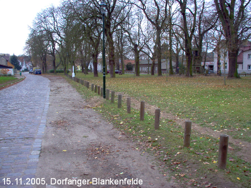 Der Dorfanger Blankenfelde ist geprägt durch seinen 4-reihigen Baumbestand. Er verläuft in Nord-Süd-Richtung und wird am nördlichen Ende durch die alte Feldsteinkirche und das Gemeindehaus begrenzt, südlich durch die alte Schmiede mit modernen Stahlskulpturen.