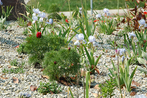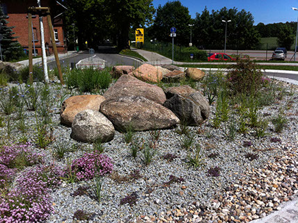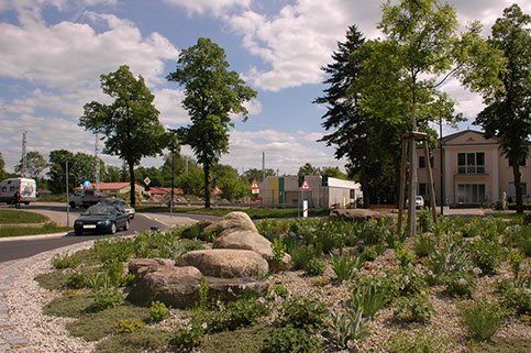 Im Zuge des Ausbaus der ICE Strecke Berlin-Dresden ließ die Gemeinde Rangsdorf an den beiden Endpunkten des neuen Verkehrstunnels jeweils einen Kreisverkehr zur flüssigeren Verkehrsführung errichten. Um den späteren Pflegeaufwand zu minimieren, haben wir uns bei der Planung der Bepflanzung für Stauden aus dem Projekt Perennemix® der Hochschule Anhalt (FH) entschieden, das Mischungen für den öffentlichen Raum entwickelt hat. Die hitzeverträglichen Stauden wurden in ein Substrat aus Splitt-Sandgemisch gepflanzt und mit Granitsplitt gemulcht. Die jeweils mittig gepflanzten Bäume (Sophora japonica (Schnurbaum)) spenden zusätzlich Schatten. Der umlaufende Kiesstreifen am Rand der Kreisverkehre lässt sich einfach sauber halten. Der Pflegeaufwand reduziert sich nach zwei Wuchsjahren auf eine jährliche Komplettmahd der Staudenfläche und gelegentliche Wassergaben für die Gehölze. Die Stauden samen sich selbst aus bzw. treiben unterirdische Ausläufer und füllen so die Fläche nach und nach aus.