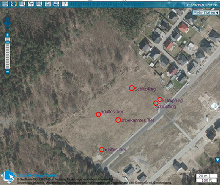 Unser Auftraggeber plant die Erschließung eines Baugebietes in Ludwigsfelde. Da das seit Jahren brachliegende, etwa 1 ha große Gelände stark von Zauneidechsen - einer europarechtlich geschützten Art - besiedelt ist, forderte die untere Naturschutzbehörde (UNB) im Vorfeld die Umsiedlung des Bestandes und deren Dokumentation. Gemäß unseren Vorgaben wurden mehrere hundert Meter Amphibienzaun aufgestellt und Eimerfallen in geeignete Strukturen eingegraben. Der Fang der Zauneidechsen erfolgte in der Zeit von April bis Juni unter Berücksichtigung ihrer Aktivitätsphasen gezielt von Hand und durch regelmäßiges Absammeln der Eimerfallen. Die Fundstellen der Reptilien wurden in einzelnen Karten dokumentiert und an die UNB gemeldet. Durch regelmäßige enge Abstimmung mit Auftraggeber und Behörde konnte die Baugenehmigung unter Wahrung der naturschutzrechtlichen Forderungen zügig erteilt werden. Die Umsetzung der Tiere erfolgte auf geeigneten Flächen in der näheren Umgebung, auf denen zuvor neue Teilhabitate unter unserer Anleitung hergerichtet wurden.